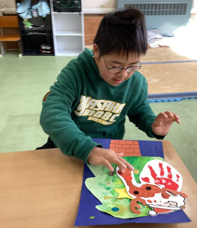 | 12月の図工ではクリスマスツリー作りをしました。ローラーで緑や赤、黄色を使って塗ったツリーにキラキラシールをたくさん貼りました。サンタとトナカイは自分の手形と足形を取り、シールで目を付けて完成です。気分はクリスマス!楽しい自分だけの作品ができ上がりました。 |