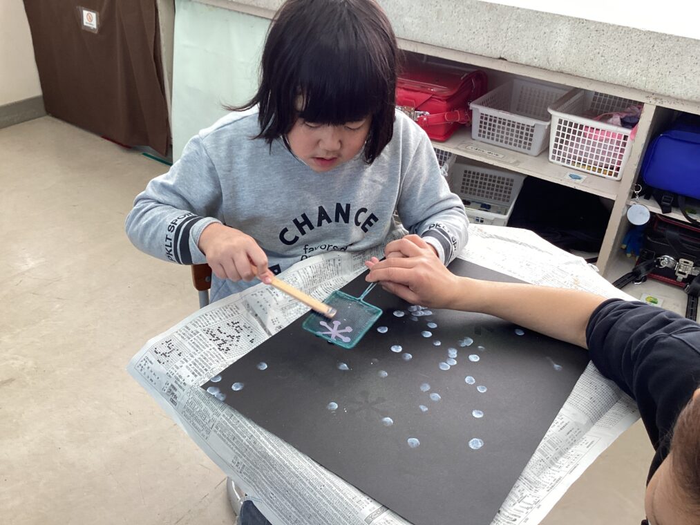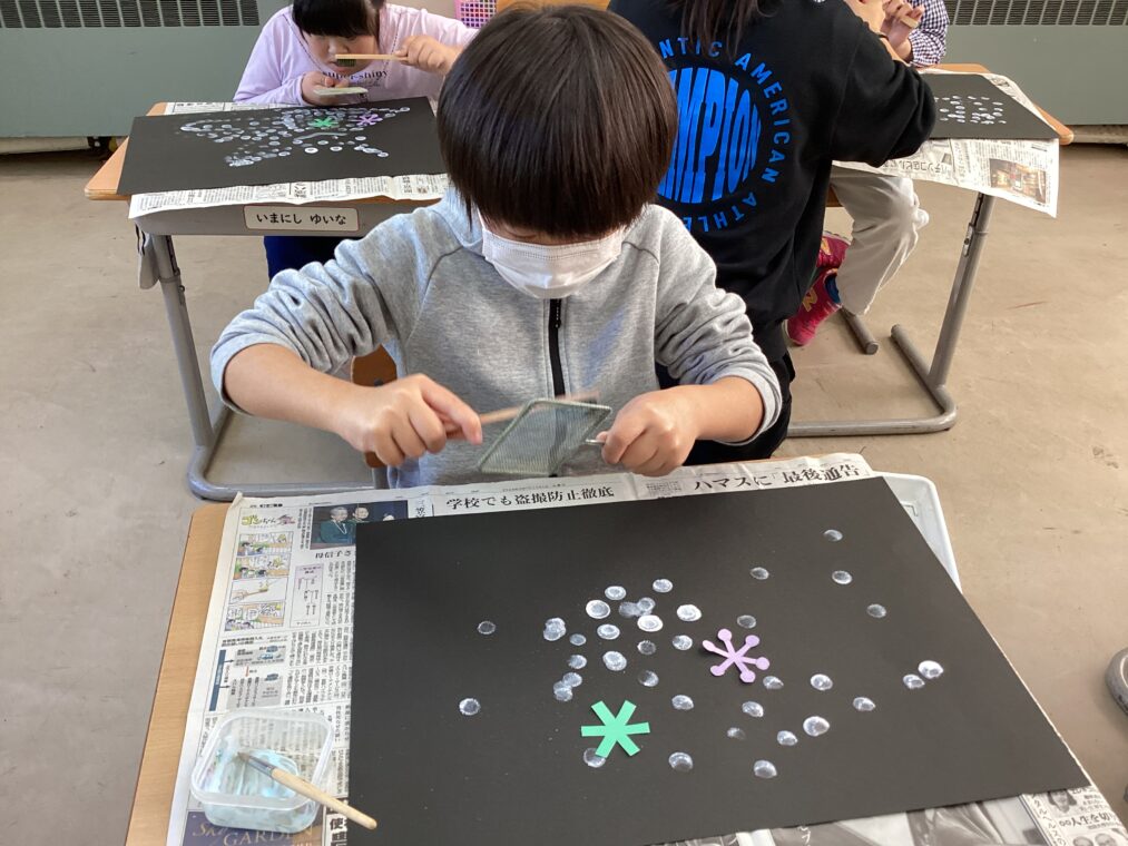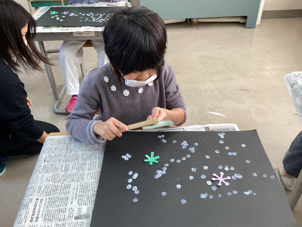| 図工では冬の作品に取り組んでいます。今週は、スパッタリングで雪を描きました。雪の結晶の型を置き、上からスパッタリングをすることで、綺麗な結晶が浮き上がりました。 |