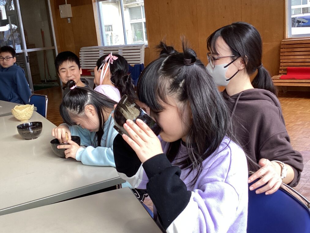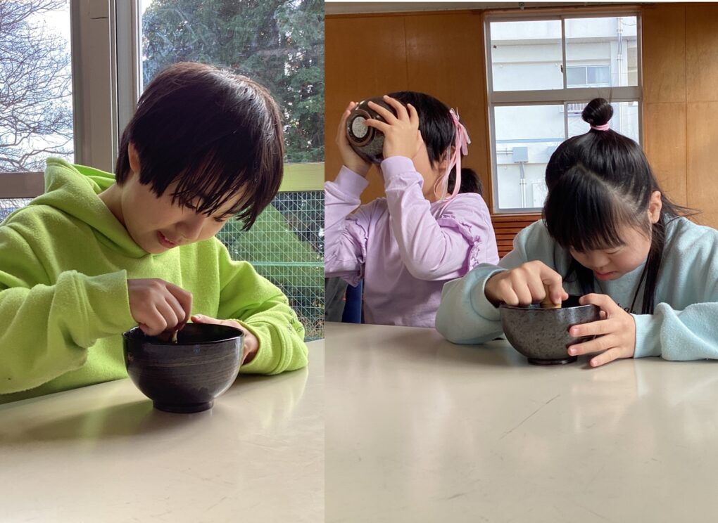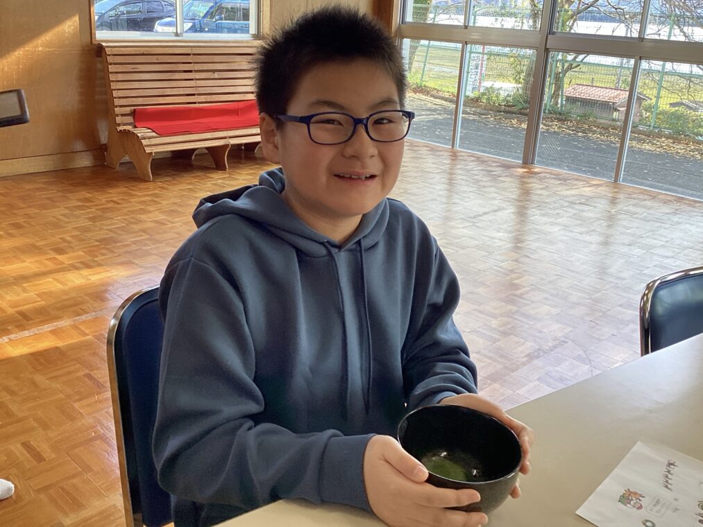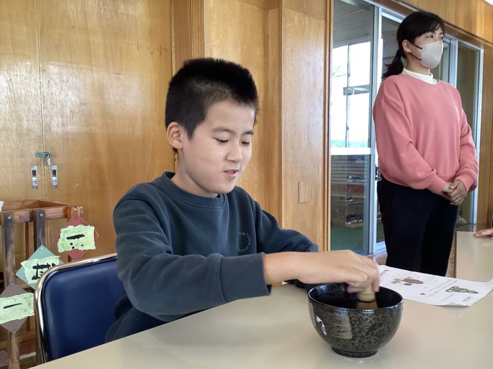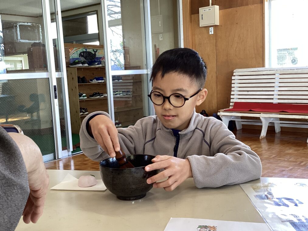 | 地域の方に来ていただき、9組の友達と一緒にお茶会を体験しました。かわいいお菓子と初めてのお抹茶に目を輝かせてわくわくが止まらないみんな。「おいしーい!」「もっとほしい!」「舌が緑になったよ!」と初めてのお茶菓子とお抹茶に感動していました。お茶の先生に作っていただいたお抹茶を飲んだ後は、自分たちも茶筅でお茶を点てる体験をし、貴重な経験を積むことができました。 |