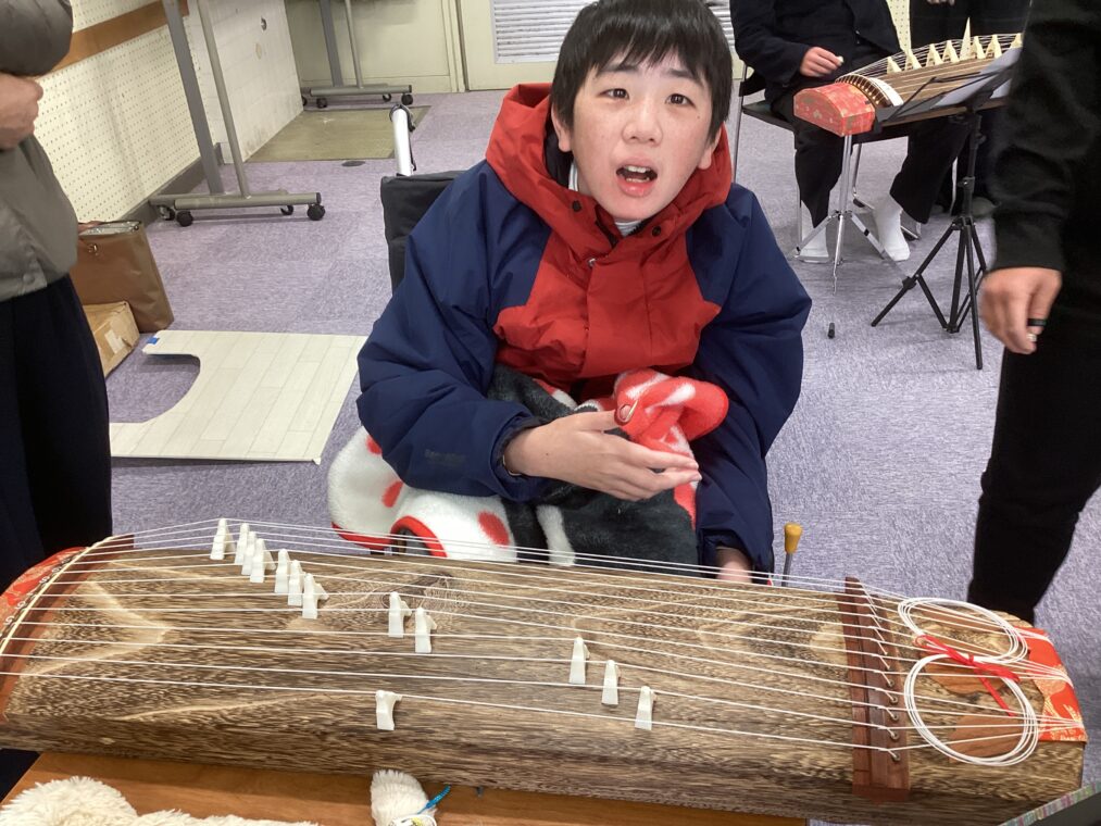 高等部2、3、4組は音楽の授業で「箏」に取り組んでいます。京都當道会より後藤様に来ていただき、箏の歴史についての講義と実技指導をしていただきました。先生の演奏を聞かせてもらい筝の音色に聴き入ったり、奏法を見たりして「箏の音色がきれいだった。」「上手だった。」と感想をもつことができました。日本の伝統楽器「箏」の良さを味わうことができました。 また、実際に「さくらさくら」の演奏にも挑戦しました。親指に「爪」をはめ、弦を弾いて音を出すと「もっと上手に弾けるようになりたい」という気持ちが沸き、意欲的に演奏に取り組む姿が見られました。今後の授業での励みになりました。