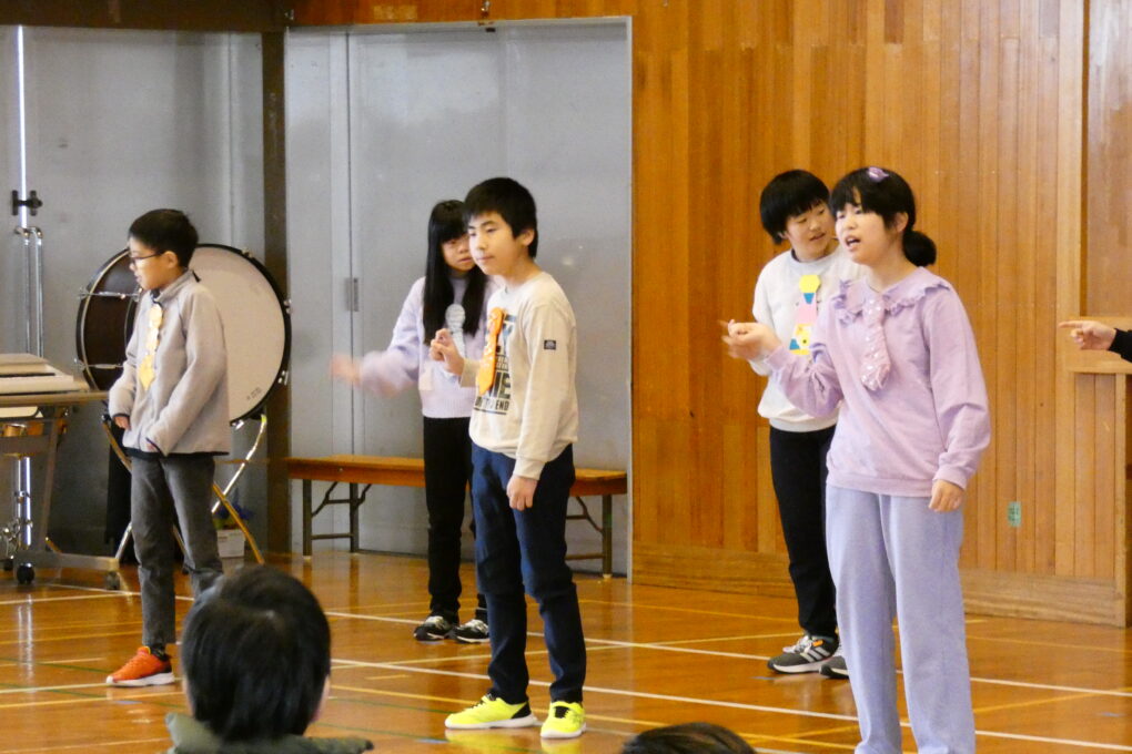 | 8~10組は器楽「きらきら星」、歌唱「明日はきっといい日になる」、ダンス「学園天国」の3曲を披露しました。器楽は、4つの楽器の中から演奏したい楽器をそれぞれが選んで挑戦しました。友達と息をぴったり合わせて演奏したり、掛け声をかけ合ったり、声を合わせて歌ったり踊ったり、友達と協力しながら、全員が自信をもって堂々と発表することができました。1年間の音楽での学習の成果を120%発揮し、高学年らしい発表をすることができ、終了後は達成感と安堵感を感じたみんなでした。 |
