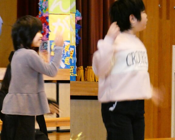 | 6・7組の「わくわくキッチン」では、それぞれ違った楽器を持ってリズムよく鳴らしました。曲のテンポの違いを意識したり、楽器の音を楽しみながら演奏することができました。「風が呼んでいる」では、スカーフを使って風を表現しました。曲の速さを意識してひらひらとそよ風を表現したり、強風を表現したりと変化を楽しみながら踊りました。「ニコニコ世界」では、全身を使って元気いっぱい、友達と手を繋いで楽しく踊りました。曲中に出てくるニコニコポーズはみんなのお気に入りでとびっきりの笑顔で発表することができました。 |