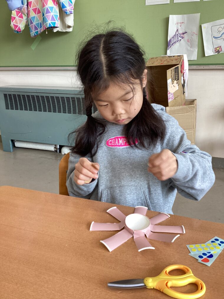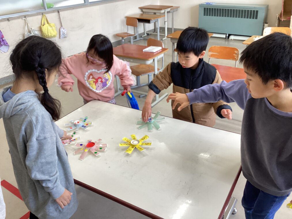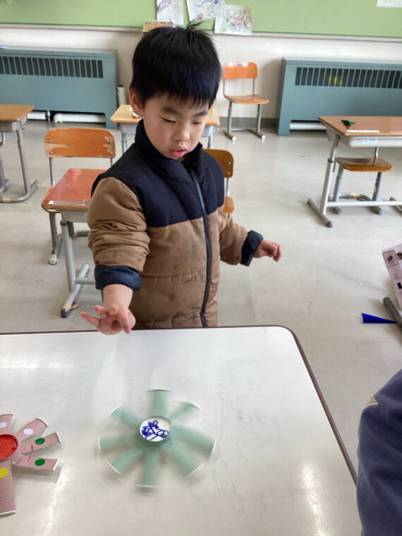 | クラス遊びで紙コップコマを作って遊びました。ハサミで切ってから、好きな模様や絵を描いたりシールを貼ったりしてカラフルで可愛いコマが完成!コマがくるくる回ると「見て見て!」と嬉しそうな子ども達でした。最後はみんなで一斉に回して楽しみました。 |