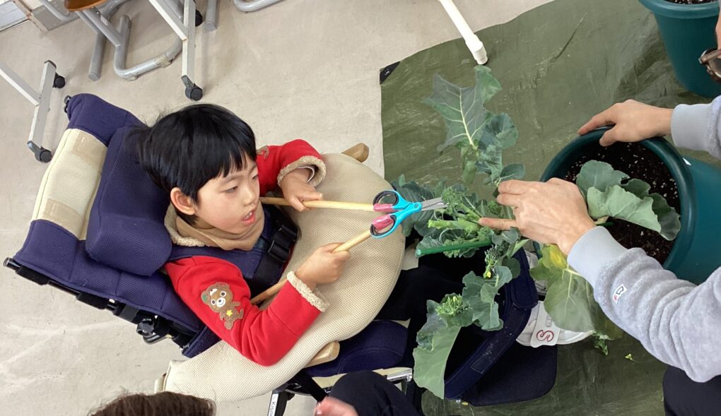 | 生活単元学習「やってみたいむ」では、以前に植えたブロッコリーが育ったので収穫しました!大きくなった葉っぱや株を観察したり、はさみで切ったりしました。 |