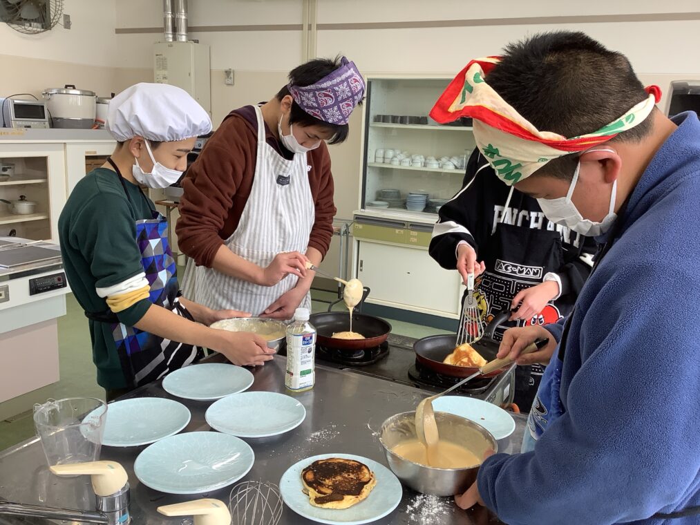 校内で「パーティー」を開く計画を立てました。話し合って考えたプログラムに沿って、ゲームをしたり、ペアでホットケーキを作ったりして、仲良く過ごしました。