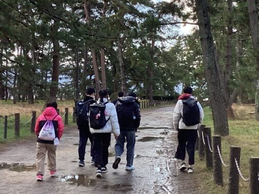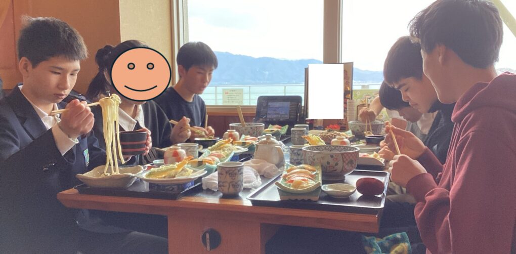 元伊勢籠神社バス停を下車後、天橋立の松並木を通り、宮津市街地まで歩きました。およそ5.5キロメートルもの長い道のりを歩いた後の昼食は格別でした。