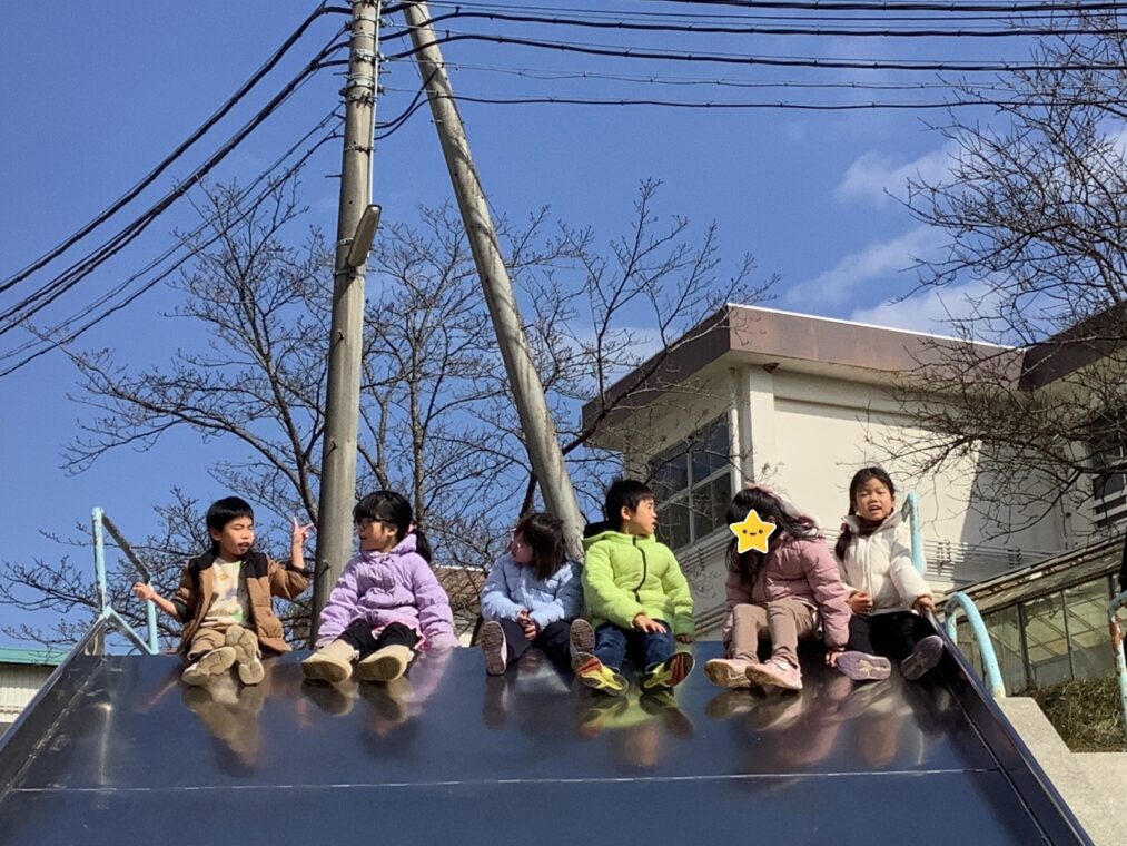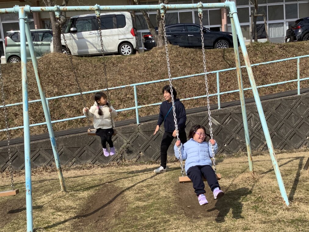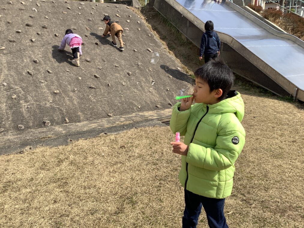 | 良いお天気だったので、みんなでグラウンドへ!思い思いにブランコやジャングルジム、シャボン玉を楽しんだり、「みんなで一緒にやろう!」と声を掛け合って、「1、2の3!」の合図で滑り台を滑ったり、元気いっぱいの笑顔が広がりました。 |