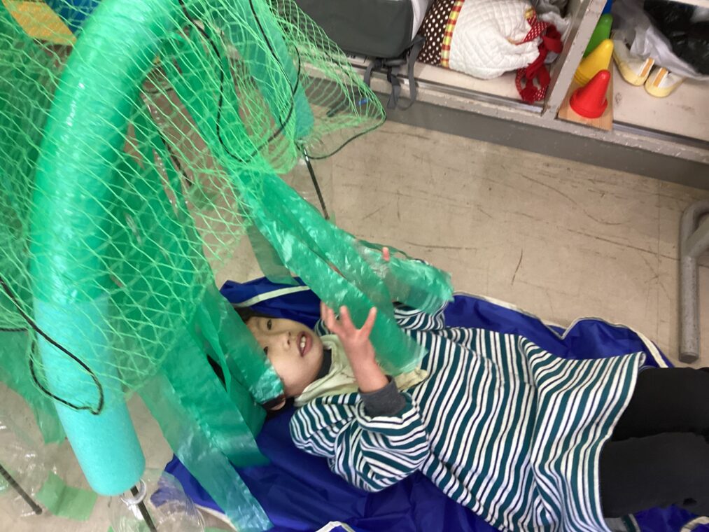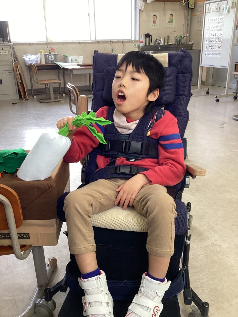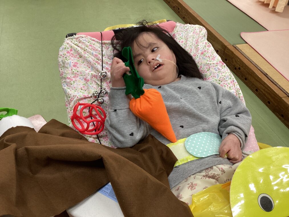 | いもむしれっしゃのパネルシアターを見た後、自分達もいもむしれっしゃに乗りました。途中で草むらの道を通り、野菜畑に到着して人参や大根を引っ張って収穫しました! |