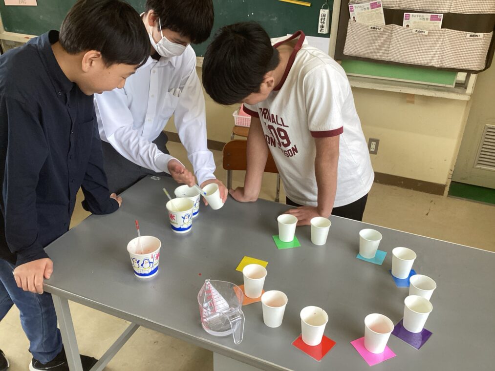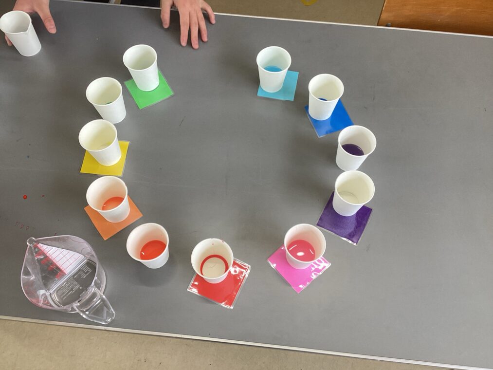4月22日(水) 中学部Hグループ 美術の学習 中学部 2026.04.23 中学部のグループでの美術の学習の様子です。 3原色(赤、青、黄)の色水を使って混色し、写真にある色相環の色を再現する学習に取り組みました。 グループで話し合い、思考錯誤しながら色づくりに取り組みました! Post Views: 75