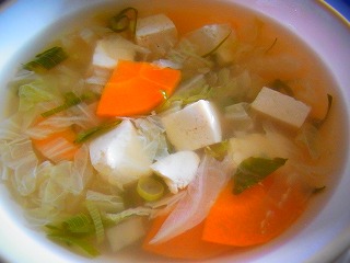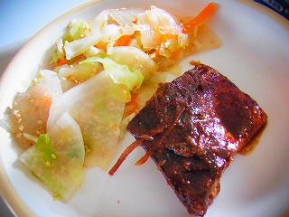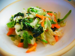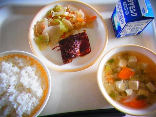 【12月8日(月)】今日のメニューは、ごはん、ひき肉入り千草焼き、キャベツのおひたし、大根のみそ汁、牛乳でした。