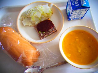 【12月10日(水)】今日のメニューは、コッペパン、ミートローフ、冬のドレッシングサラダ、かぼちゃのポタージュ、牛乳でした。