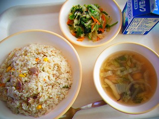 【12月11日(木)】今日のメニューは、焼き豚チャーハン、中華サラダ、春雨スープ、牛乳でした。