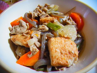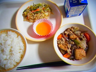 【12月12日(金)】今日のメニューは、ごはん、根菜の甘辛煮、ビーフン入り野菜炒め、オレンジゼリー、牛乳でした。
