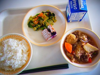 今日の給食 1月19日(月)~23日(金) 今日の給食 Twitter Facebook はてブ Pocket LINE コピー 2026.01.19 Post Views: 8 【1月19日(月)】今日のメニューは、ごはん、肉じゃが、小松菜の中華和え、米粉のブルーベリーケーキ、牛乳でした。人気のケーキは、米粉と豆乳でつくり今回はブルーベリーを入れていただいています。
