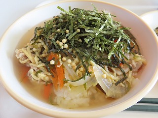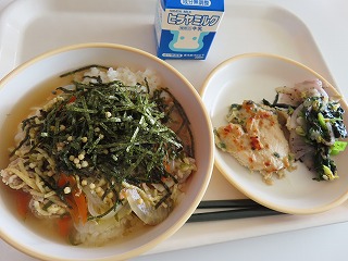 【2月4日(水)】今日のメニューは、ごはん、栄養満点出汁茶漬け風、鶏肉のごまだれ焼き、白菜のゆかり和え、牛乳でした。今日の出汁茶漬け風は、「宮津を食べようコンテスト」で宮津小学校6年1組が考えたメニューです。出汁は煮干しでとっており、具材の彩りも考えてくれました。これからぞくぞくとコンテスト応募献立が登場しますので、楽しみにしてください!