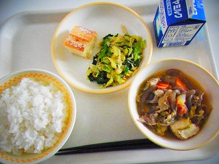 【2月2日(月)】今日のメニューは、ごはん、ポークチャップ、フレンチサラダ、さつまいものスープ、牛乳でした。