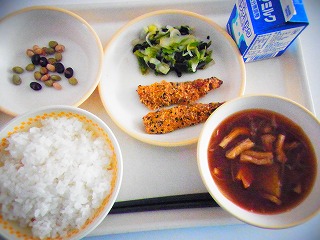 【2月3日(火)】今日のメニューは、ごはん、イワシのごまフライ、白菜の甘酢和え、油揚げのみそ汁、福豆、牛乳でした。今日は節分メニューです。