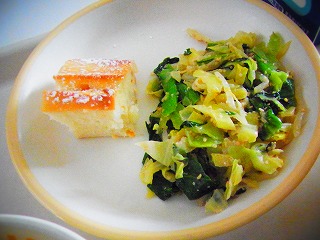 【2月6日(金)】今日のメニューは、ごはん、すきやき風煮、キャベツのおひたし、米粉のオレンジケーキ、牛乳でした。すき焼き風煮は、肉や白菜、白ネギ等の野菜、焼き豆腐などが入った具だくさんの煮物です。