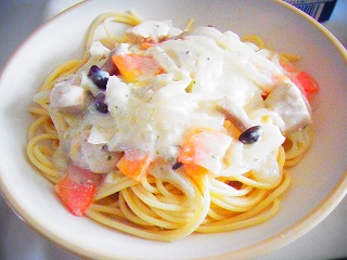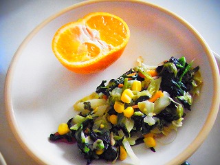 【2月5日(木)】今日のメニューは、鶏肉ときのこのクリームスパゲティー、宮津天橋立彩りソテー、由良みかん、牛乳でした。宮津小の6年2組が考えたほうれん草、ベーコン、コーンのソテーでした。