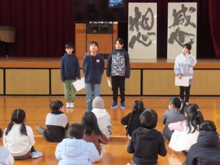 先日の立会演説会を受けて、来年度の4月から前期児童会メンバーになる4名の任命式をしました。新会長から「みんなが信じて投票してくれたことを忘れずに、一生懸命がんばります」とあいさつがありました。よりよい吉津小学校にするために、今の本部の姿を引き継ぎ、新しいことにもチャレンジして頑張ってくれることを楽しみにしています。