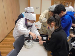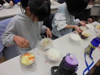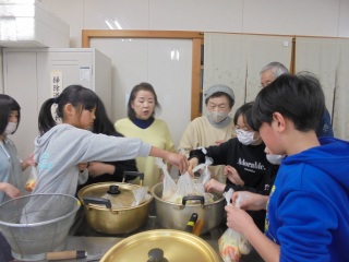 今日は、地域の婦人会さん主催の「防災」を考えよう!という取組に5年生が参加しました。ポリ袋を使って、湯煎で防災食を作る方法を教えてもらいました。地域の長寿会のみなさんや婦人会のみなさんと一緒に作り、食べました。湯煎しただけで、美味しく、そして温かいポトフとごはん、大根とサバの煮物がいただけました。「避難するときは、顔見知りがたくさんいた方が安心ね。」と地域の方に伝えていただき、笑顔いっぱいの活動となりました。