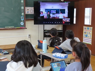 今日は、3小の5年生が総合的な学習の時間に学習したことについて、1年間の成果を交流し合いました。リモートでの交流でしたが、各校の学びについて感想を伝え合ったり、おたずねをし合ったりできました。それぞれの学びを知る中で、宮津市の地域の良さも実感することができました。また、「私たちも来年はこんなことを…」等と来年度の学習内容についても、見通しをもつとともに期待を膨らませる様子も見られ、素敵でした。