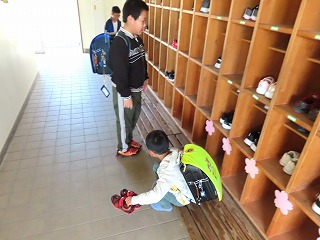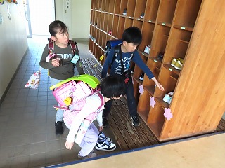 1年生が登校班で上級生と一緒に登校してきました。上級生が気にかけて、靴箱を確かめたり、教室での朝の準備を一緒にしたりととても微笑ましい様子でした。