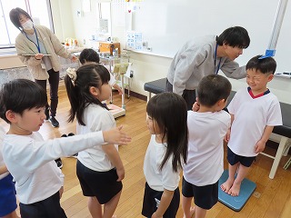 身体計測ではきちんと並んで背の高さや体重をはかりました。上手に保健室を使うことができてとてもかっこいい1年生でした。