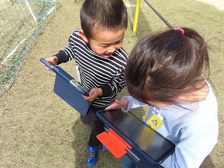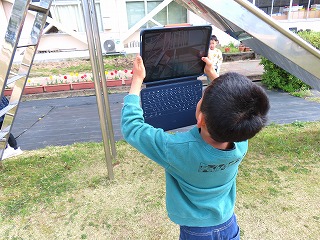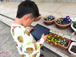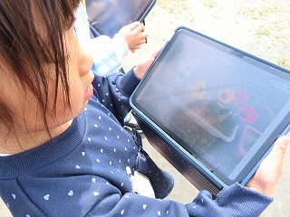 使い方が分かったあと、早速外に出てタブレットで写真を撮ってみました。チューリップや滑り台を撮っていました。1年生も含め、タブレットをどんどん学習で使うことで、どの子も文房具の一つとして、適切に使えるようになってほしいと思います。
