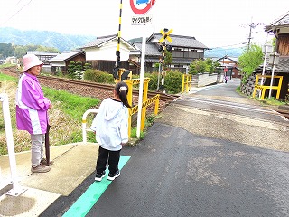 今日は、1年生の交通安全教室を行いました。まずは、交通指導員さんに道路の歩き方や渡り方を教えていただきました。雨も降らずに学校の周りを実際に歩きました。地域の婦人会の方にもご協力いただき、信号のある交差点や踏切の渡り方も実際に歩き、左右をよく見て車が来てないことを確かめることが大事だとわかった1年生でした。