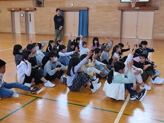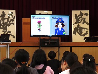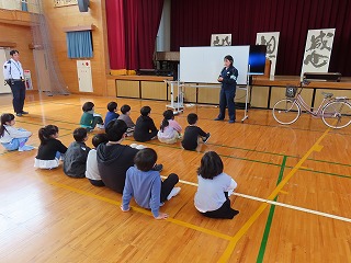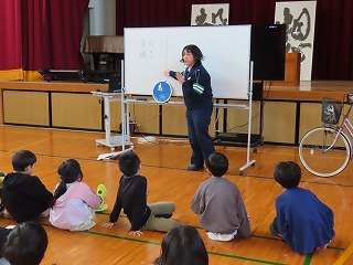 今日は、自転車教室を外で実施する予定でしたが、前日の雨のためグランド状態が十分ではなかったので、体育館で自転車教室を行いました。交通指導員さんや駐在所のおまわりさんに来ていただき、自転車は車の仲間なので左側を走ること、歩道を小学生は自転車で走ってもいいことなどを教えていただきました。高学年の時には、4月から自転車の違反にも青切符が切られることも話していただきました。真剣に話を聞いていて、とてもすてきでした。