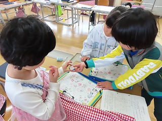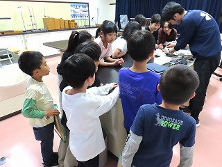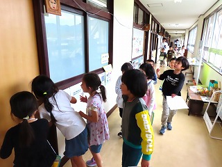 各教室にはスタンプが置いてあり、2年生が1年生にスタンプのふたを開け、自分で押させてあげるなど、とてもやさしくかっこいい姿でした。理科室では、6年生が実験をしている様子も見せてもらっていました。