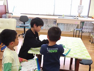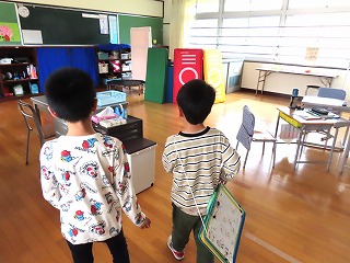 2年生が1年生を連れて、学校の校舎を案内しました。2年生と1年生がペアになり、何という教室(部屋)なのか、何をする教室なのかを2年生が1年生に説明し、校舎内を歩き回りました。