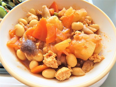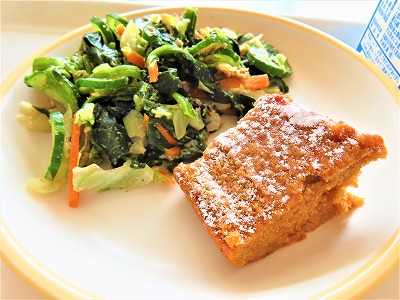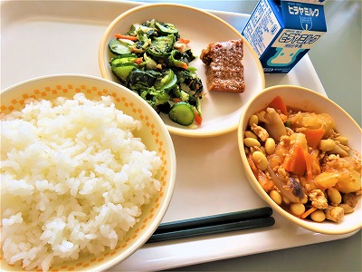 【9月17日(水)】今日のメニューは、ごはん、カレービーンズ、ほうれん草のごま和え、米粉の黒糖ケーキ、牛乳でした。