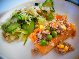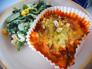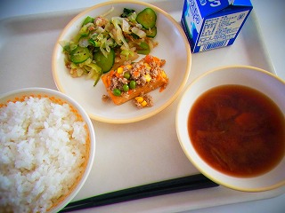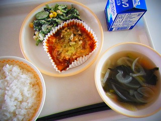 未分類【9月19日(金)】今日のメニューは、ごはん、なすとかぼちゃのチーズ焼き、ツナとピーマンのサラダ、たまねぎのスープ、牛乳でした。