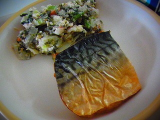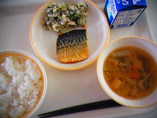 【9月18日(木)】今日のメニューは、ごはん、サバの塩焼き、和風のりポテトサラダ、けんちん汁、牛乳でした。