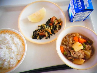 【9月29日(月)】今日のメニューは、ごはん、肉じゃが、ほうれん草のコク旨炒め、梨、牛乳でした。