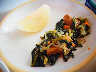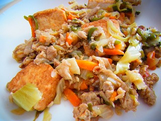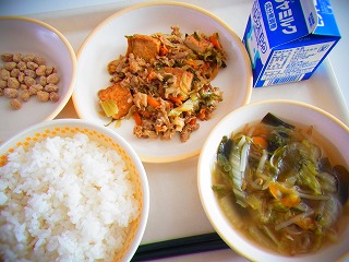 【10月1日(水)】ごはん、豚肉と厚揚げのみそ炒め、わかめスープ、きなこ豆、牛乳でした。