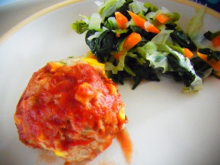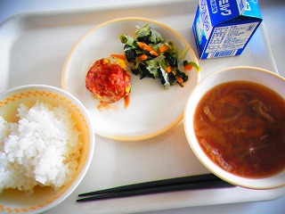 【10月2日(木)】ごはん、肉団子のコーン蒸し、キャベツのサラダ、たまねぎのみそ汁、牛乳でした。