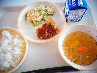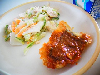 【10月3日(金)】ごはん、ヤナギのごまケチャップソースがけ、ツナマヨサラダ、大豆とさつまいものスープ、牛乳でした。