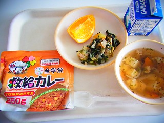 【9月30日(火)】今日のメニューは、救給カレー、ジャーマンポテト、豆腐のスープ、オレンジ、牛乳でした。
