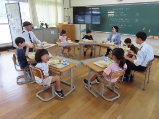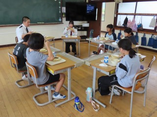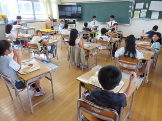 金曜日は、海洋高校生が給食を一緒に食べに来てくれました。その日の献立の『ヤナギのゴマケチャップソースがけ』に使われているヤナギを捌いてくれました。「どれくらい捌きましたか?」「何時間くらいかかりますか?」「捌く時に難しいことは何ですか?」「海洋高校ではどんな勉強ができますか?」等たくさん質問をして、答えてもらいました。食べ終わった後は、ババ抜きをして一緒に遊んでくれる人もいました。給食がいつもよりさらに美味しく楽しく感じることができました。