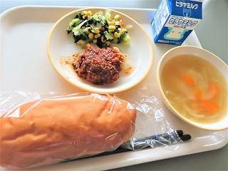 【10月8日(水)】コッペパン、ヤンニョムチキン、コーンサラダ、コンソメスープ、牛乳でした。