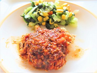 【10月10日(金)】ごはん、玉ねぎと芋の甘辛煮、中華サラダ、ブルーベリーの米粉ケーキ、牛乳
