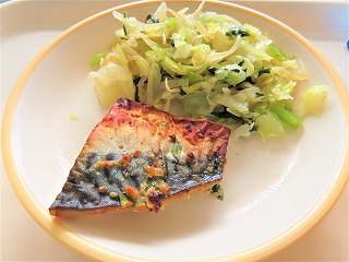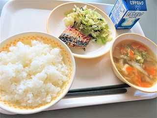【10月9日(木)】ごはん、サバのごまだれ焼き、キャベツの甘酢和え、けんちん汁、牛乳