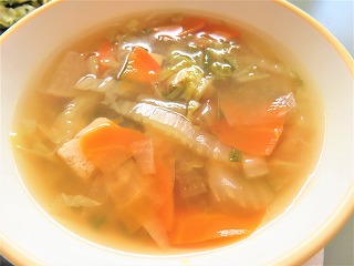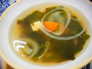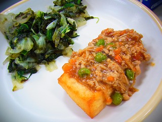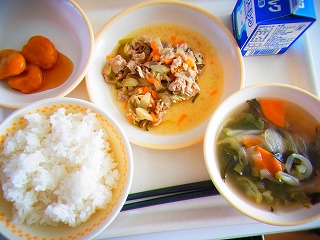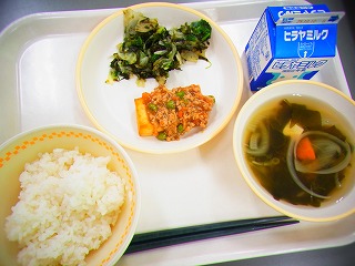 【10月6日(月)】ごはん、厚揚げのピリ辛あんかけ、のりのりキャベツ、豆腐のすまし汁、牛乳でした。