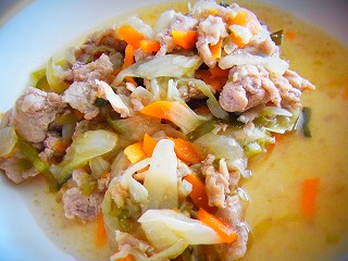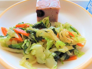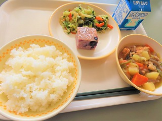 【10月7日(火)】ごはん、豚肉のスタミナ炒め、ウインナーとこまつなのスープ、かぼちゃ団子、牛乳でした。