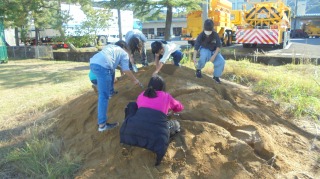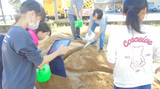 5年生が理科の学習で「流れる水のはたらき」を調べるために実験をしました。総合的な学習の時間に「浸水害」について学習していたこともあり、土砂くずれはカーブの外側と内側のどちらの方が危険かについて、あらかじめ予想をして実験しました。山に溝をつくり、上から水を流します。「あっという間に泥水になった!」「外側の方が流れがはやい!」「じょうろ2つを一度に流したらどうなる?!」等と協力して、学びを創りながら、たくさんのことに気付く姿が素晴らしかったです。