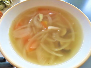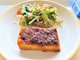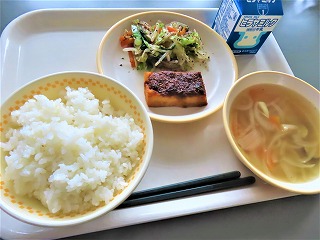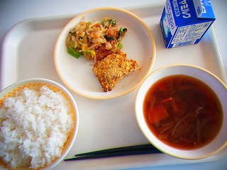 今日の給食【11月18日(火)】今日のメニューは、ごはん、厚揚げのねぎみそ焼き、小松菜のゆかり和え、オニオンスープ、牛乳でした。