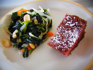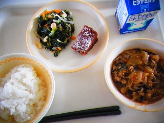 【11月19日(水)】今日のメニューは、ごはん、ひじき入りマーボー大根、ほうれん草と大豆の中華サラダ、ごぼうのチョコケーキ、牛乳でした。